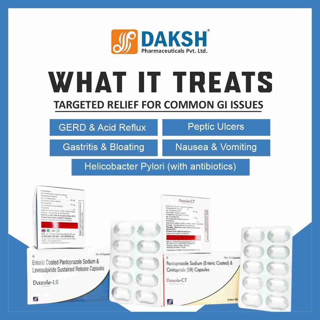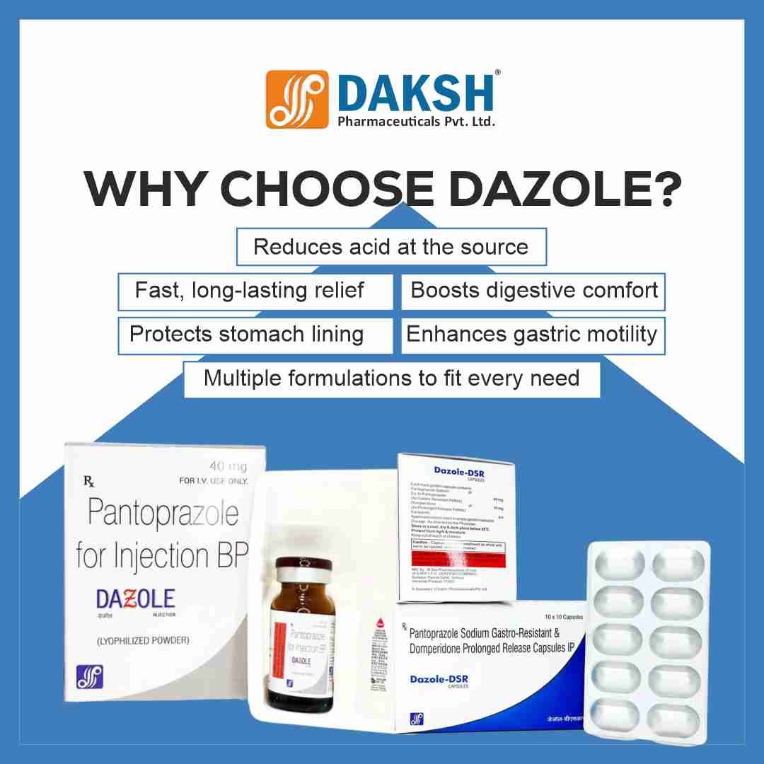 DAZOLE® provides comprehensive acid control with Pantoprazole-based formulations designed for long-lasting relief from GERD, acidity, and digestive discomfort.