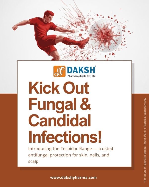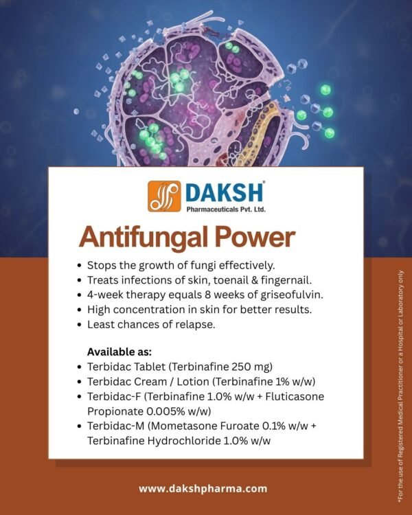 TERBIDAC® is a broad-spectrum antifungal formulation containing Terbinafine, a highly effective agent for treating fungal skin and nail infections. It eliminates infection at the root by stopping fungal growth and preventing recurrence.